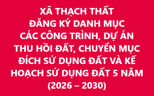 Có nhu cầu đăng ký Danh mục thu hồi đất, chuyển mục đích sử dụng đất và Kế hoạch sử dụng đất 05 năm (2026-2030) trên địa bàn xã Thạch Thất có văn bản gửi về UBND xã Thạch Thất (qua Phòng Kinh tế xã) trước ngày 22/9/2025. (Lưu ý: Các cơ quan, đơn vị, cá nhân khi gửi văn bản đăng ký công trình, dự án đề nghị gửi kèm các văn bản pháp lý của các công trình, dự án còn hiệu lực thực hiện).