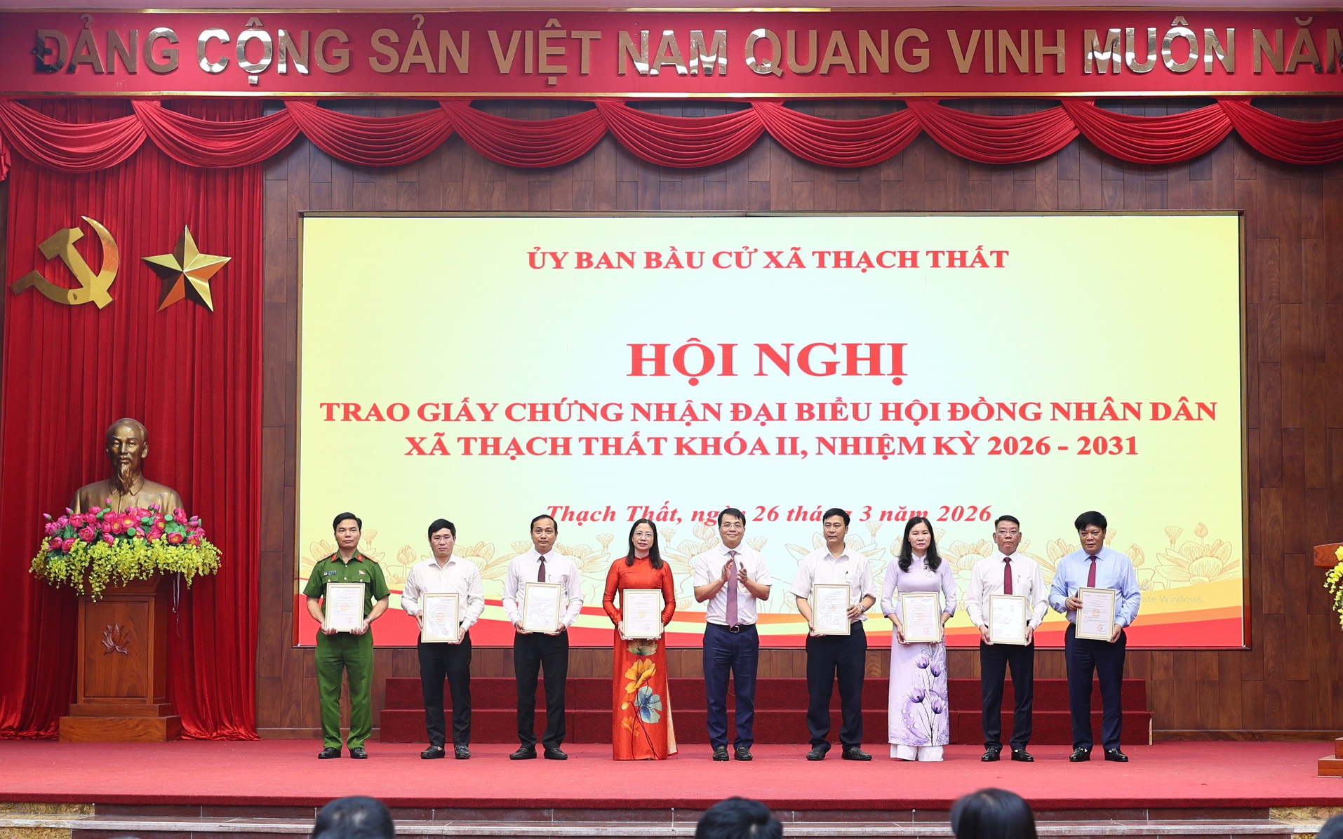 Ngay sau lễ dâng hương, Ủy ban Bầu cử xã Thạch Thất đã long trọng tổ chức Hội nghị trao Giấy chứng nhận đại biểu Hội đồng nhân dân xã khóa II, nhiệm kỳ 2026 – 2031. Tại hội nghị, các đại biểu đã nghe công bố Nghị quyết của Ủy ban bầu cử xã về công nhận kết quả trúng cử đại biểu HĐND xã khóa II. Ủy ban Bầu cử xã đã trao Giấy chứng nhận cho 26 đại biểu, ghi nhận vai trò, trách nhiệm của những người đại diện cho ý chí, nguyện vọng của cử tri địa phương trong nhiệm kỳ mới.