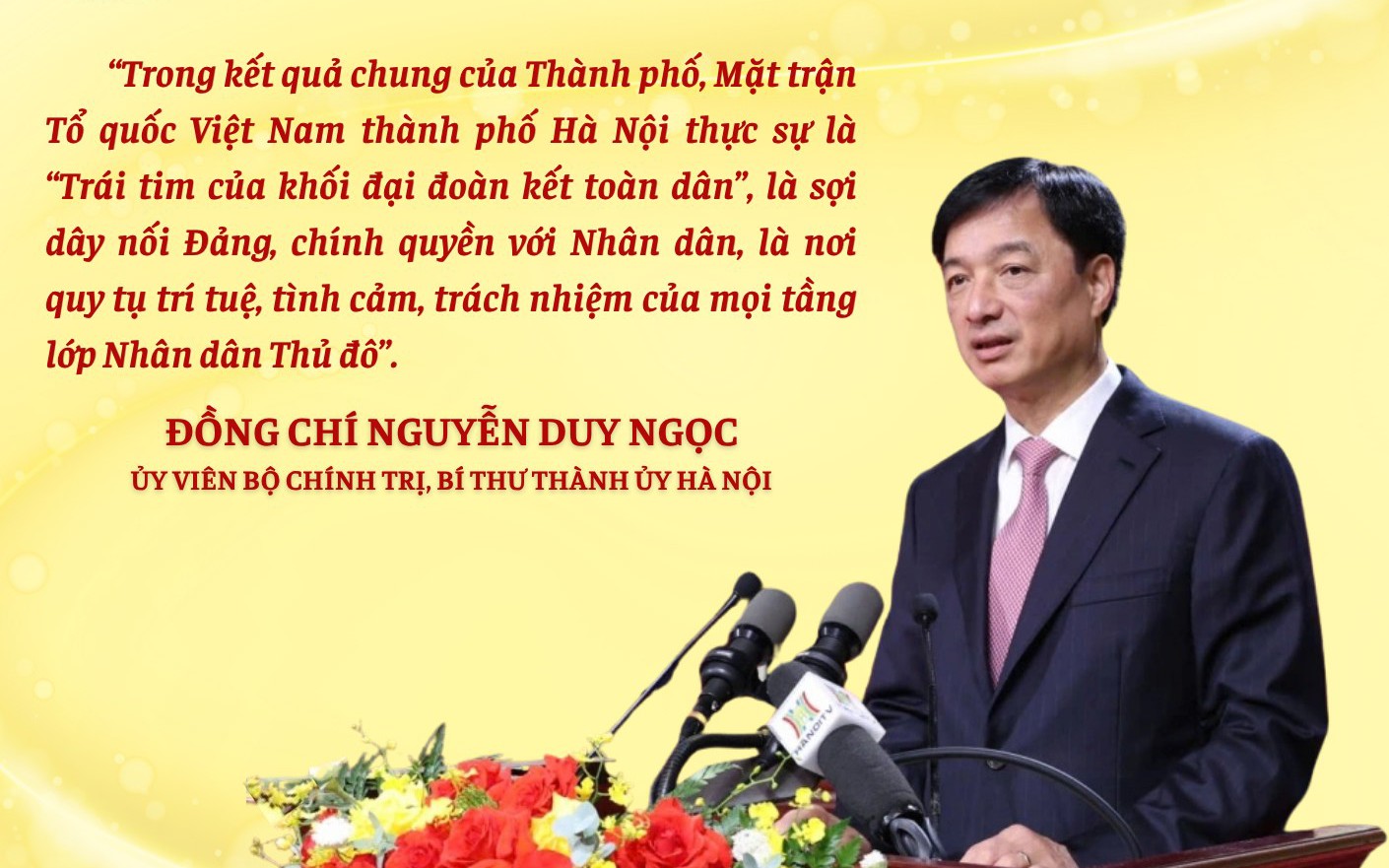 Trong kết quả chung của thành phố, MTTQ Việt Nam thành phố thực sự là “trái tim của khối đại đoàn kết toàn dân”, là sợi dây nối Đảng, chính quyền với Nhân dân, là nơi quy tụ trí tuệ, tình cảm, trách nhiệm của mọi tầng lớp Nhân dân Thủ đô; bám sát chỉ đạo của Ủy ban Trung ương MTTQ Việt Nam và của Thành ủy Hà Nội để triển khai tổ chức thực hiện, hoàn thành thắng lợi Nghị quyết Đại hội MTTQ Việt Nam thành phố Hà Nội lần thứ XVIII, nhiệm kỳ 2024 - 2029 như báo cáo của Ủy ban MTTQ Việt Nam thành phố đã nêu.