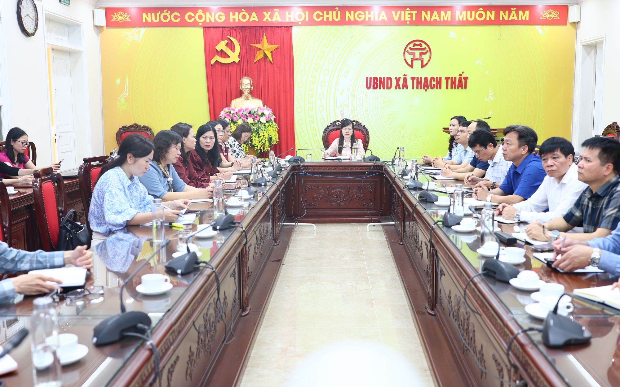 Tham dự tại điểm cầu xã Thạch Thất có các đồng chí thành viên Ban Chỉ đạo và Tổ Thường trực giúp việc Ban Chỉ đạo điều tra cơ sở hành chính, sự nghiệp của xã; lãnh đạo, chuyên viên liên quan của Phòng Văn hóa – Xã hội; cùng công chức, viên chức được giao nhiệm vụ thực hiện kê khai thông tin vào phiếu điều tra của các cơ quan Đảng, tổ chức chính trị - xã hội và các đơn vị sự nghiệp công lập trên địa bàn.